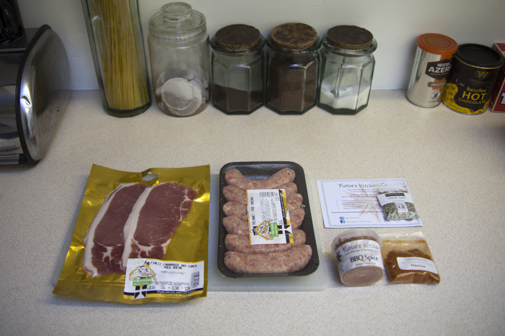 Here is ‘The Haul’; bacon and sausages from The Kernow Sausage Company, BBQ and Harrissa spice from Nature Kitchen. I realised I couldn’t do this by myself (sharing is caring right?) so I invited a couple of friends round to help test the food. We started with the Trelawney sausages;