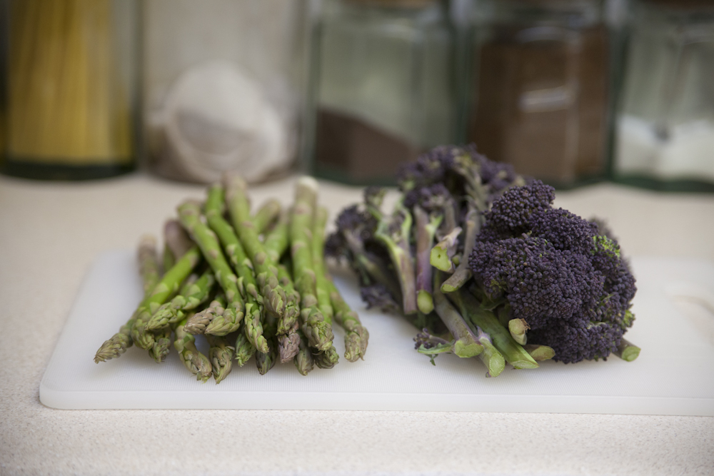 Served with asparagus and purple broccoli that had been boiled for about 30 seconds to a minute.