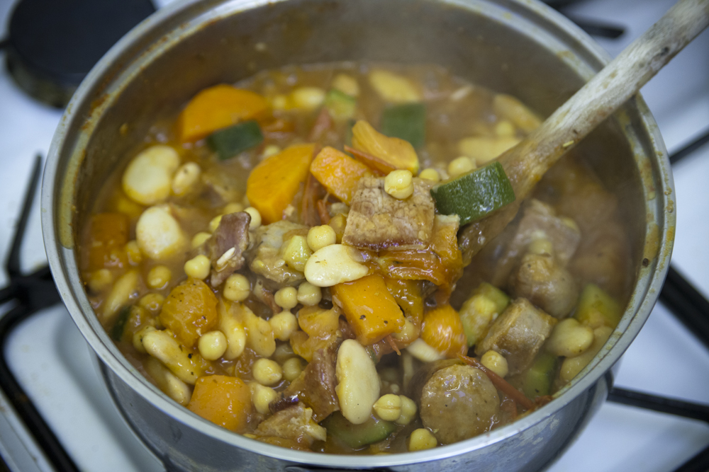 I boiled up some carrots and courgettes then added them to a pan with chickpeas, butterbeans, the bacon and sausage and a couple of tomatoes. Then poured over some veg stock and added a generous helping of the spices.